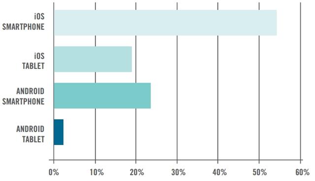 Theo báo cáo gần đây nhất của Good Technology tiết lộ (một công ty chuyên cung cấp phần mềm sử dụng an toàn cho người dùng doanh nghiệp): Tính đến cuối Quý 4/2013, các thiết bị iOS đã được kích hoạt đến 73%, tăng so với mức 72% trong Quý 3/2014 và 69% ở Quý 2/2013. Còn về phía Android thì giảm “thấy thương” xuống còn 26% trên tổng số các thiết bị được kích hoạt.