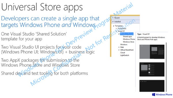 Như có thể nhìn thấy trong các bức ảnh rò rỉ, Microsoft đã đề cập đến một kho ứng dụng thống nhất được gọi là "Universal Store" có thể phục vụ cho cả hai hệ điều hành là Windows Phone và Windows. Kho ứng dụng này có thể giúp 80% quá trình thiết kế ứng dụng trên hai hệ điều hành tương thích với nhau và chỉ có 20% sự khác biệt cho từng hệ điều hành.